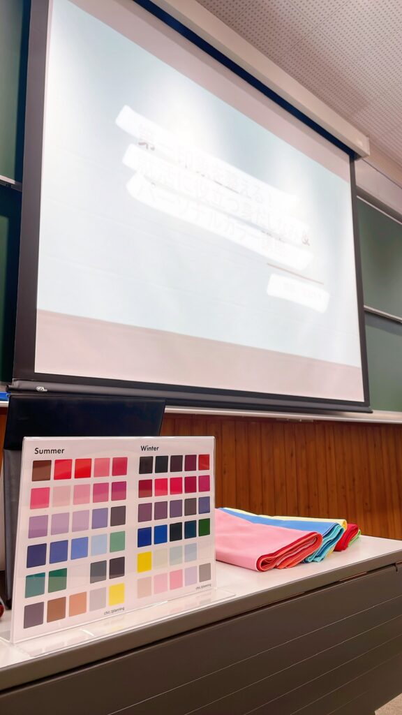 今回は、男子学生を中心に100名定員の特別講座でのパーソナルカラーに関する講義です。
